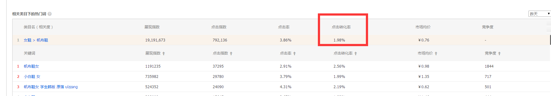 接下来去直通车的流量解析输入帆布鞋查找转化率(流量解析-推广词表下载-相关类目下的热门词)